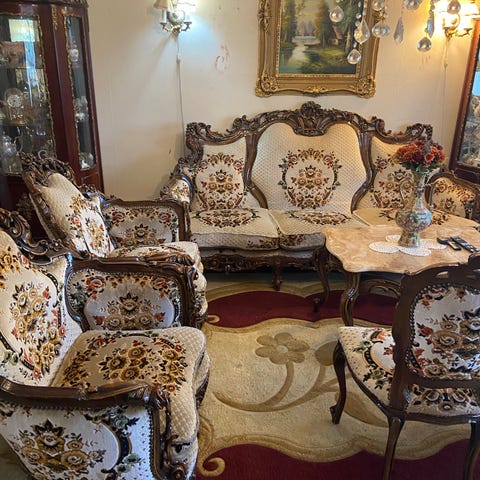 Gammel flott salong sofa bord og fire stoler i nydelig litt lys rødfarge til sakgs samlet 2900kr