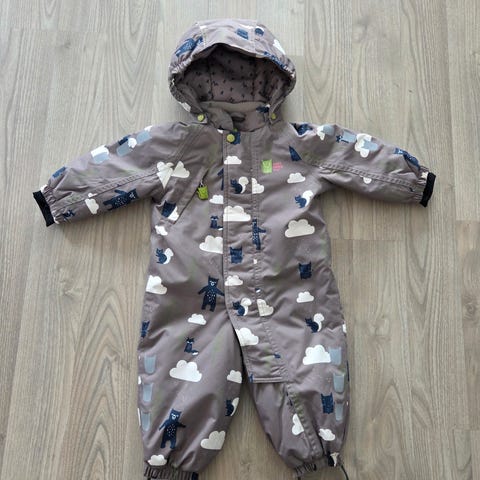 Kattnakken parkdress for jente i størrelse 68. Dressen er laget i polyester og har lilla bunnfarge med mønster. Modellen har hette, glidelås foran og elastikk ved ermer og ben for bedre passform. Egnet som yttertøy for små barn i hverdagsbruk og utendørs lek.