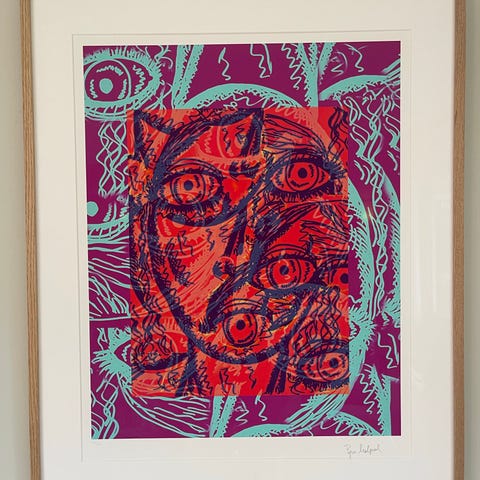 Vakkert og intenst grafisk verk av en av Norges mest anerkjente samtidskunstnere (f. 1952). Motivet viser en kvinne med intenst blikk som "dukker opp" midt i et tett, organisk kaos av blader, blomster (ligner tistler), striper og former i blå, lilla, gule og rosa toner – typisk for Killi-Olsens surrealistiske, ekspressive stil der mennesket smelter sammen med naturen på en poetisk og litt urolig måte.