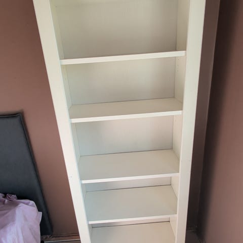 Bokhyllen er synlig brukt, men med lett overflatepussing og lakkering av hyllene vil den bli som ny igjen.