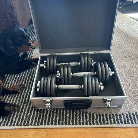 Manual justerbare manualer i metall. Settet består av to manualer med løse vektskiver som kan tas av og på for å tilpasse ønsket vekt. Stengene er rette med skrulås i endene for å sikre vektskivene under bruk. Passer til styrketrening hjemme eller på treningsrom, og kan brukes til ulike øvelser for overkropp og armer.