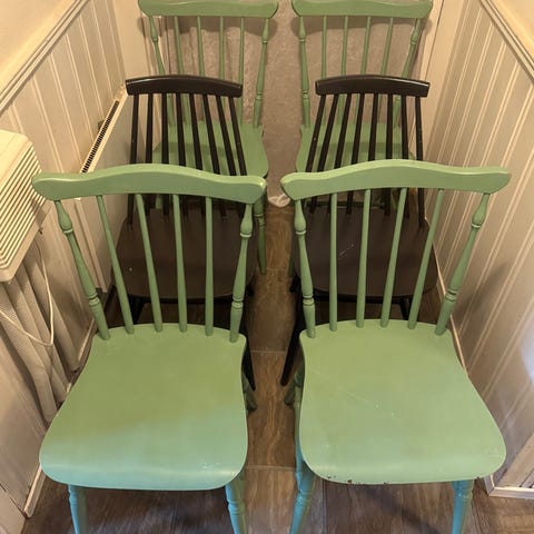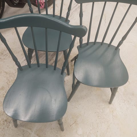 Selger to stoler i tre som jeg har malt selv i en mørk grønn farge. Stolene har klassisk spile-rygg og passer fint til spisebord, på kjøkkenet eller som dekorative stoler i et rom.