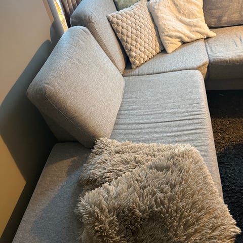 Sofaen er pen, komfortabel og i god stand. Passer fint i stuen. Den er brukt, men godt tatt vare på.