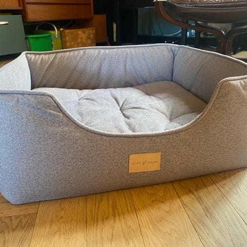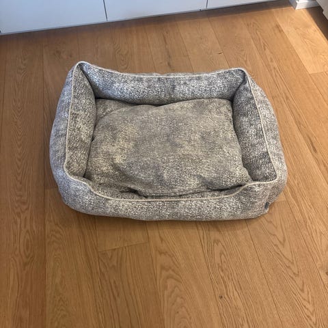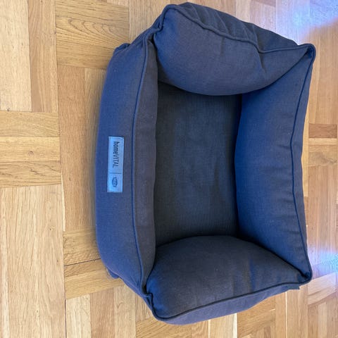 Rektangulær seng med myk, polstret pute med glidelås, hvor man kan ta ut fyll om