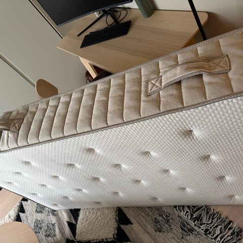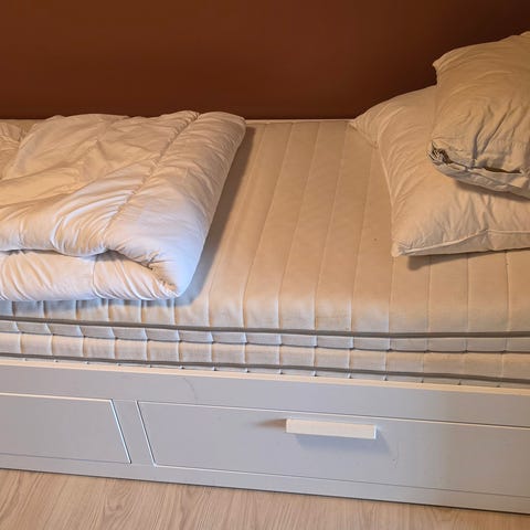 DUX seng med overmadrass. Sengen har quiltet tekstiltrekk på rammen og en lys, vattert overmadrass. Passer som komplett sengeenhet i soverom. Str 180x200m