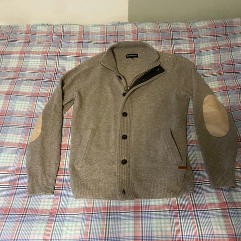 Gran Sasso cardigan for herre i størrelse L. Cardiganen er laget i kasjmir og ull og har beige Orginalpris 5200kr. Legg merke til et par småhull på bilde nr 2. de er på ryggen og på ene armen. Dette merkes ikke ved bruk, men nevner slik at du vet det. Dette påvirker prisen.