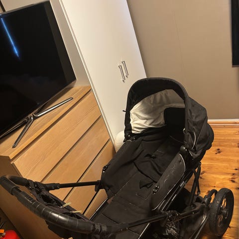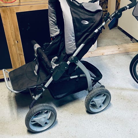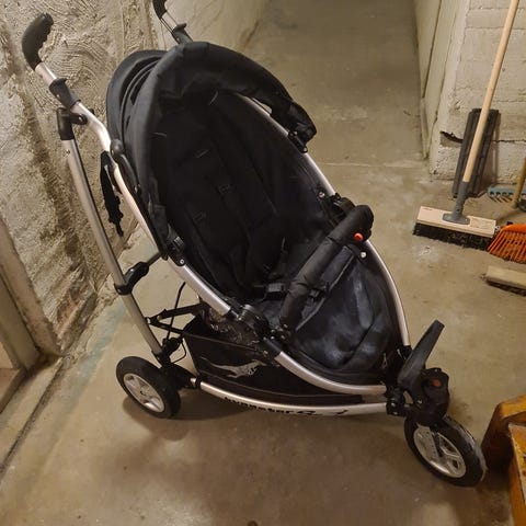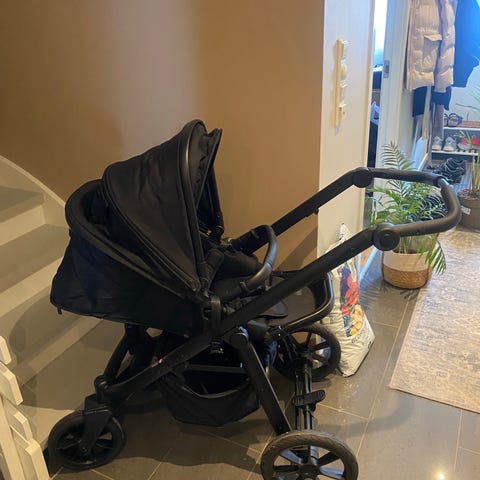 Teutonia sportsvogn i svart tekstil med justerbart håndtak og tre hjul. Vognen har polstret sittedel, fempunktssele og avtagbar frontbøyle. Ryggstøtten kan justeres, og kalesjen gir skjerming mot vær og vind. Passer som trille eller sportsvogn til større barn på tur i hverdagen.