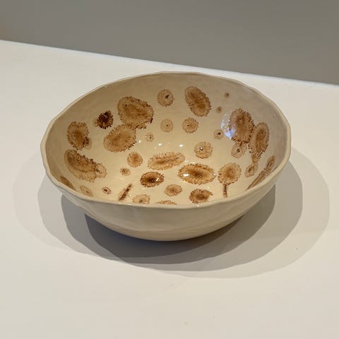 Helt ny håndlaget keramikk skål, cirka 18 cm i diameter. Dekorert med to forskjellige glasurer, en på innsiden og en annen på utsiden, men i samme farge palett.
