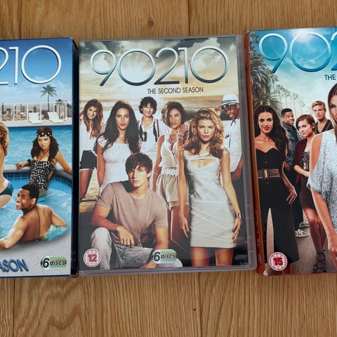 90210 DVD-bokser med sesong 1 (The First Season) og sesong 2 (The Second Season). Inneholder TV-serien 90210 fordelt på to separate DVD-utgivelser. Egnet for avspilling på DVD-spillere som støtter regionen angitt på coveret og aldersgrensen 15 år for sesong 2.