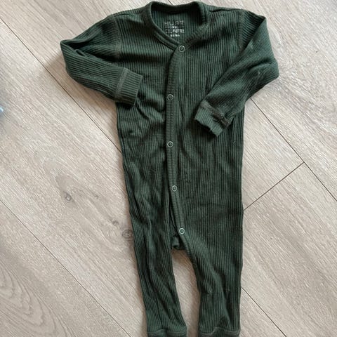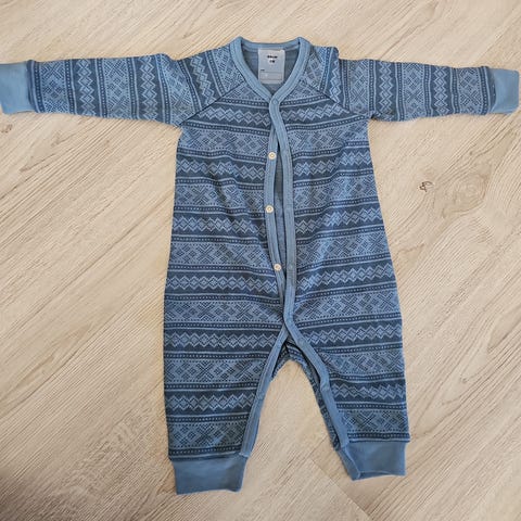 Deilig, myk pysj i 50 % ull, 45 % bambusviskose og 5 % polyamid. Størrelse 68. Godt brukt, normal bruksslitasje uten flekker eller hull. Fra Hust and claire.