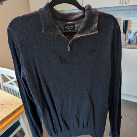 SAND Copenhagen genser for herre i størrelse S. Genseren er i blå ull og har høy hals med kort glidelås i front. Modellen har ribbestrikket kant nederst og ved ermene. Passer til hverdagsbruk og kan brukes alene eller over skjorte.