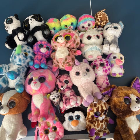 Ty kosedyr i små størrelser i ulike farger og dyrefigurer. Myke plysjfigurer med store øyne, egnet som leker eller pyntegjenstander på barnerom. Flere forskjellige dyr og fargekombinasjoner i samme samling, slik som panda, ugle og andre fantasidyr i sterke farger.