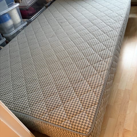 Madrass med tilhørende overmadrass og sengebunn.