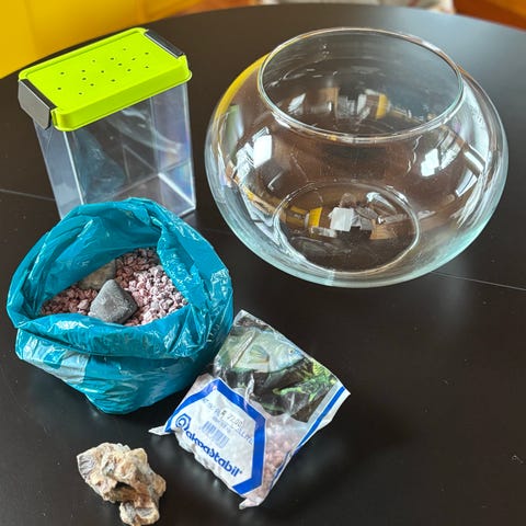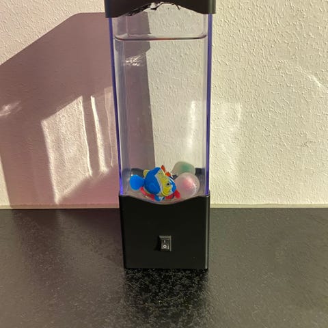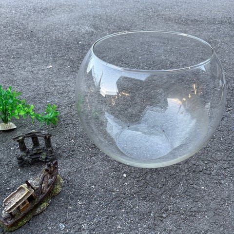 Akvarium dekorasjon med rund glassbolle, blå akvariegrus og ulike dekorasjonsfigurer. Pakken inneholder en glassbolle, blå grus i pose, en bilfigur til å plassere i bollen eller akvariet, kunstig korall i blå/grønne toner samt flere skjellformede dekorasjoner i lys farge. Egnet som innredning i mindre akvarier eller som dekorativt bordelement med maritimt preg.