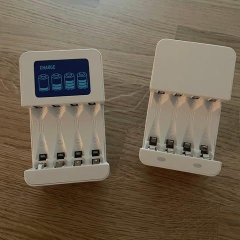 Sony BCG-34HLD batterilader for oppladbare Ni-MH AA- og AAA-batterier. Laderen har plass til fire batterier om gangen og drives via nettstrøm (100–240 V, 50–60 Hz). Farge grå. Egnet til lading av standard oppladbare AA- og AAA-batterier av nikkelmetallhydrid-type (Ni-MH).