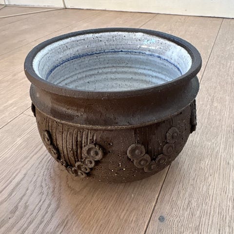 Keramikk figur formet som en kvinne. Figuren er laget i brun keramikk med påsatte, glaserte blomster- eller bladformer rundt kjolen og hodet. Ansiktet er stilisert med lukkede øyne. Passer som dekorasjonsgjenstand i interiør, for eksempel på hylle, skjenk eller bord. Bunnen har åpning og signatur fra keramiker.