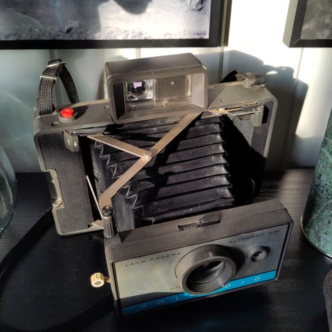 Polaroid 320 kamera med tilhørende blitzutstyr. Kameraet er et klassisk Polaroid-modellnummer 320, beregnet for øyeblikksbilder på film. Bildene viser kamerahus med optisk søker, samt separat blitzreflektor og esker med blitzpærer/flashbulbs. Utstyret passer for brukere som ønsker et analogt Polaroid-kamera med originalt tilbehør, eller som samlerobjekt. Spesifikke tekniske data som filmtype og eksponeringsinnstillinger følger ikke av bildene og bør eventuelt kontrolleres mot original brukermanual eller produsentinformasjon.