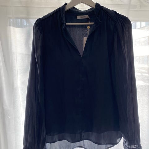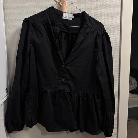 Jean Paul bluse for dame i størrelse M. Blusen er svart og laget av bomull. Den har lange ermer, v-utringning med volangdetaljer og knappelukking foran. Passer til både hverdags- og kontorantrekk, og kan kombineres med bukser eller skjørt. Materialet er lett og velegnet til bruk gjennom store deler av året.