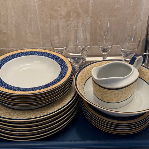 Middagstallerkener og ulike serveringsdeler. Serviset er i hvitt porselen med blå kantdekor og detaljer i gullfarge. Bildene viser flere stablede tallerkener, dype tallerkener/fat,samt sausenebb og serveringsboller. Passer til bruk ved middager og servering der det er behov for et komplett servise med matchende deler.