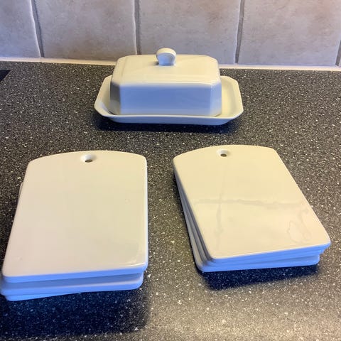 Porselen smørboks med tilhørende fat i hvit glasert utførelse. Rektangulær form med bølget kant og hank på lokket. Dekor med fuglemotiv på siden og lokket. Passer til servering og oppbevaring av smør eller andre mindre matvarer på bord eller kjøkkenbenk.