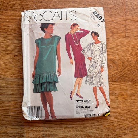 Pakken viser oversikt over alle mønsterdeler, inkludert for- og bakstykke, ermer og halskant. Størrelser og målskjema finnes på baksiden av mønsterarket. Egner seg til søm av kjoler i vevde stoffer for dame.