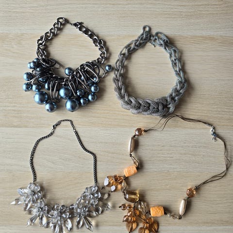 Smykker, armbånd og øredobber selges samlet. Kan ikke finne noen feil eller mangler, bortsett fra at en del øredobber har ikke bakdeler.