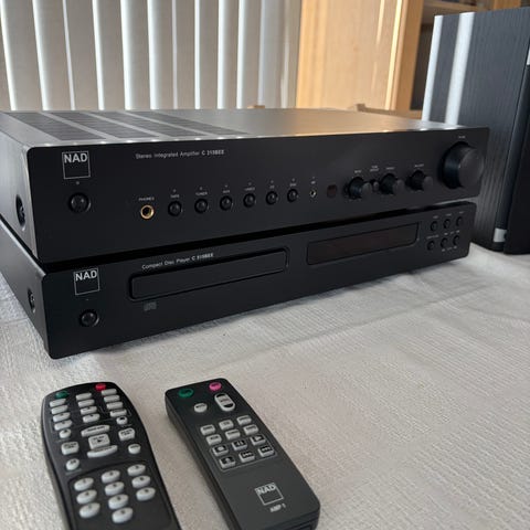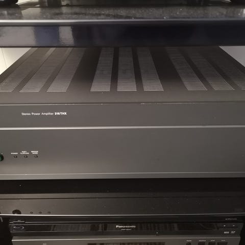 Integrert forsterker med seperat forforsterker og effekttrinn, 2x80W i 8ohm. Fjernkontroll følger med.