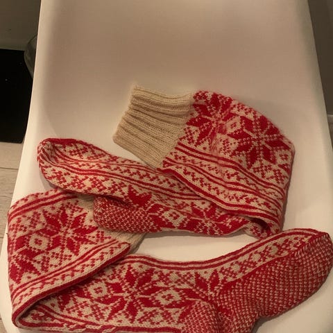 Hjemmestrikkede nikkers-strømper, passer til skostørrelse 37. Omkretsen rundt leggen er ca 25 cm