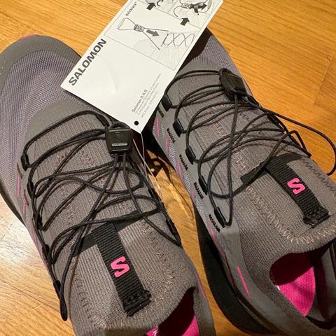 Salomon løpesko for løping i størrelse 38. Skoene har blå og gule detaljer med overdel i pustende meshmateriale og snøring foran. Yttersålen har mønster som gir godt grep på underlaget. Egnet til løping og annen trening utendørs.