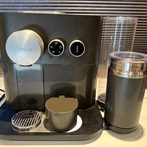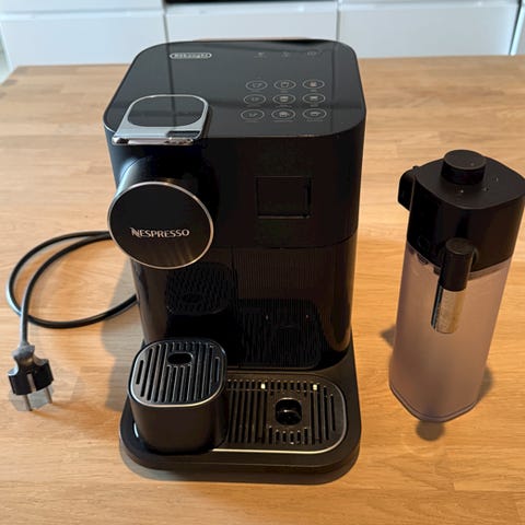 Nespresso kaffemaskin, Melkeskummer og stativ.
