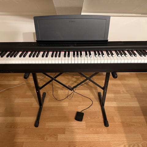 Vurderer å selge mitt Yamaha P-121 Digital Piano. Pianoet er meget pent brukt og kun brukt i huset. Det er 73 tangenter. Det følger med original strømforsyning, sustain-pedal, notebrett og bruksanvisning. På forsiden er det uttak for to hodetelefoner. Mål på pianoet er: 1114 x 295 x 166 mm og veier 10 kg. Trekket som vises på det siste bildet har jeg fått laget (det kan følge med). Jeg har dessverre ikke originalesken så dette må hentes. Jeg bruker dessverre ikke Vipps, så enten kontantbetaling eller bankoverføring gjelder. Foretrekker kontakt via finn.no.