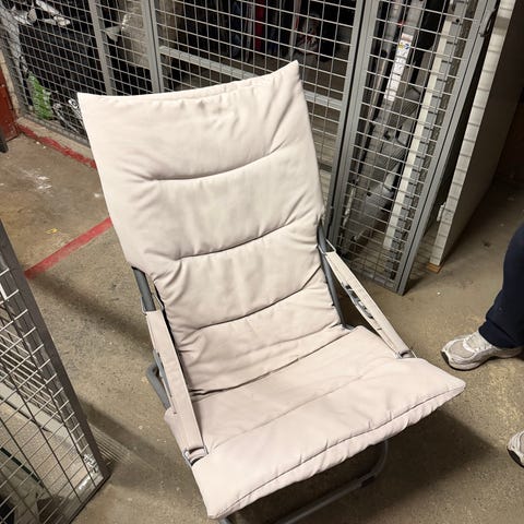 Sammenleggbar stol i svart stoff med metallramme. Stolen har høy rygg og sete i polstret tekstil, samt sammenleggbart understell som gjør den enkel å lagre og transportere. Liten lomme på siden. Perfekt for strand