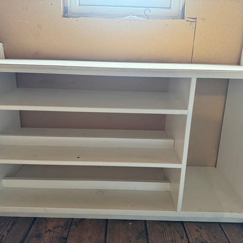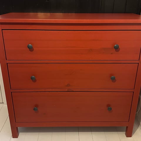 Kommode med 5 skuffer, skrivebord og bokhylle - alt i tre gis bort.