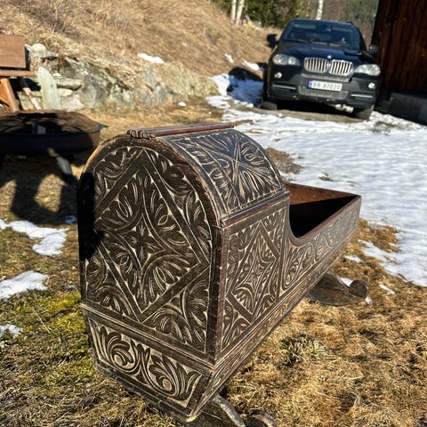Nydelig håndmalt tre vugge i mindre størrelse, egnet som dekorasjon eller til dukker. Vuggen er laget i treverk og har gyngende meier. Sidene er dekorert med malte vintermotiver og blomsterdetaljer. Overkantene er buede, og hjørnene har dreide stolper med røde detaljer. Passer som pyntegjenstand eller som del av en samling med tradisjonelt utformede treleker.