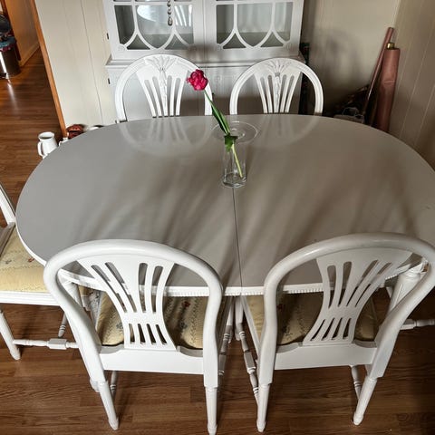 Lasert eikebord med 3 klaffer, 2 stoler med armlen og 4 stoler uten armlen