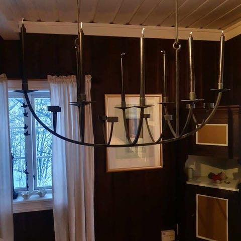Lysekrone taklampe i smijern med 6 armer og hvite plisserte lampeskjermer. Klassisk, dekorativ utforming som passer godt i stue, spisestue eller hytte. Lampen henges i krok i taket og gir plass til flere lyspærer for god belysning over bord eller i oppholdsrom.