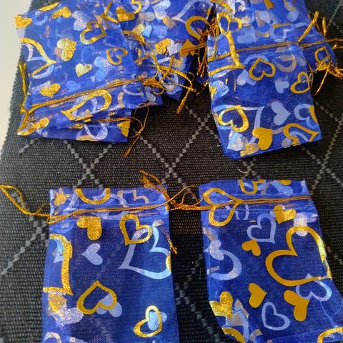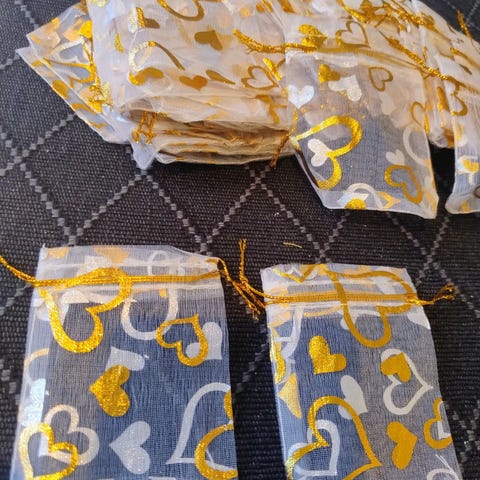 50 stk hvite flotte silke / organza poser med sølv hjerte motiver.