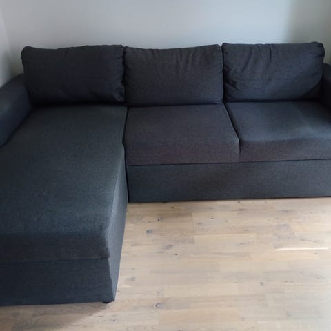 Hel og fin sovesofa/hjørnesofa med oppbevaringsrom i sjeselong del. Dras enkelt ut på hjul for å sette opp sovedelen. Lite brukt sofa og sovedel!