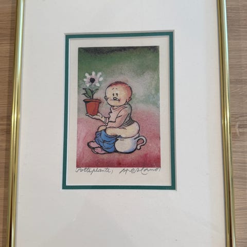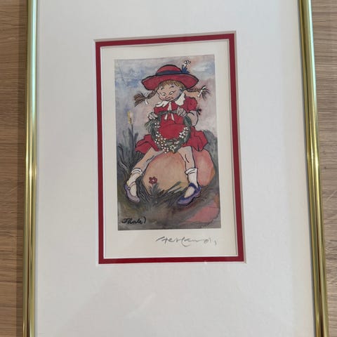 Verket er signert nede i høyre hjørne og har påskrift nede til venstre. Maleriet er innrammet med lys passepartout og enkel gull metallramme.