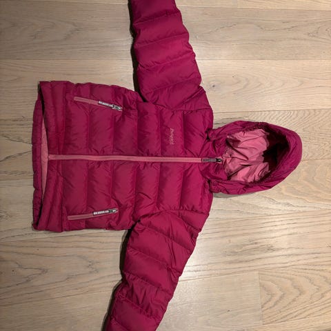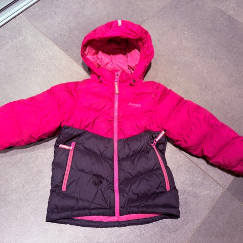 Bergans jakke for barn i størrelse 116. Jakken er i rosa nyanse med kontrastfelt og glidelås foran, samt lommer med glidelås. Graffiti buksen er i rosa/oransje tone med seler og justerbar midje. Egnet til bruk i kaldt vær, for eksempel til hverdags og uteaktivitet i barnehage eller skole.