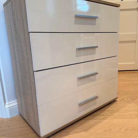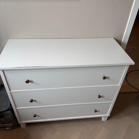 Selger en liten kommode. Har noen mørke flekker oppå og nedi den øverste skuffen.