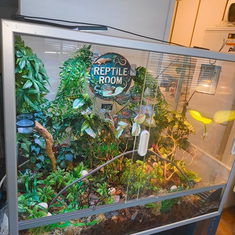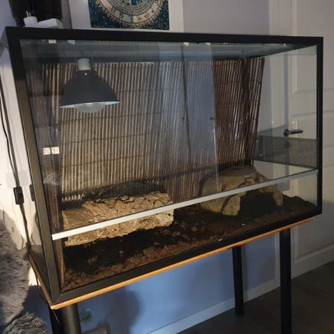 Pent brukt, selges med alt inventar og utstyr, substrat, lamper, lys, huler, dekor osv til svært lav pris. Innredet for pigghaleagam, passer for en rekke andre dyr/ insekter/ edderkoppdyr. Mål: 95x40x50. Nypris for alt er ca kr. 5000,-. Selges høystbydende til førsthentende. Fosen, Karmøy kommune.