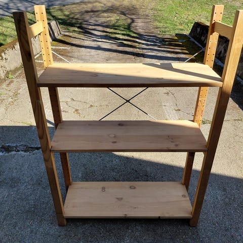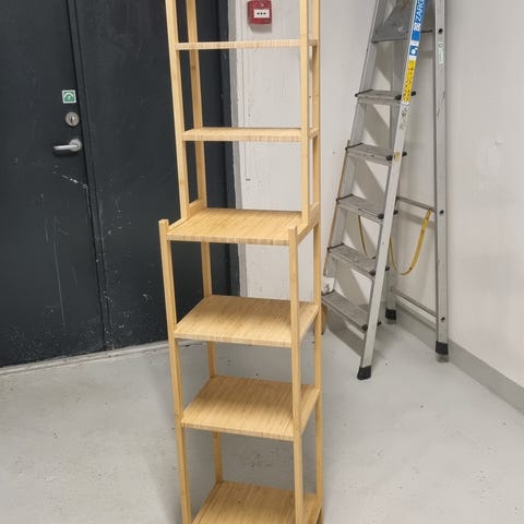 Solid furu hylle til oppbevaring av bøker eller andre gjenstander. Hyllen er stødig og kan stå fritt i rommet, eller festes til vegg.