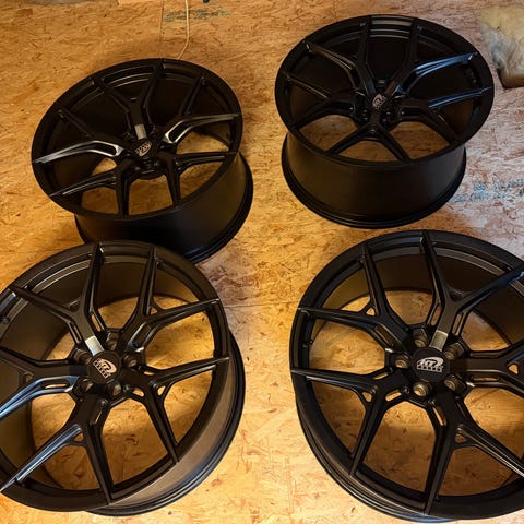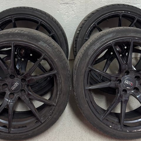 Komplette hjul med 19" felger og sommerdekk. De ble kjøpt nye i 2023 for 22 000kr. Felgene har noen mindre bruksmerker som er flekket over (illustrert på bildene). Dekkene har rett i overkant av 4mm mønsterdybde og holder nok to sesonger til, alt etter kjørelengde.