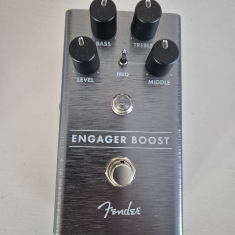 Fender Link I/O lydgrensesnitt i svart. Enheten har et stort kontrollhjul på toppen for justering av nivå, samt tilkoblinger i front og bunn for instrument og utgang. Egnet for tilkobling av gitar eller andre instrumenter til kompatible enheter for opptak eller øving. Passer for brukere som ønsker et kompakt og enkelt lydgrensesnitt fra Fender.