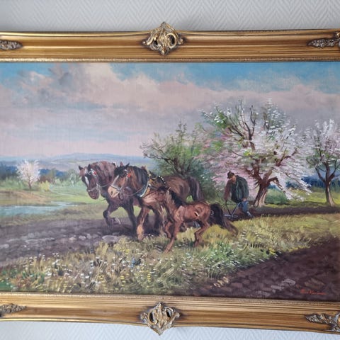 Signert maleri som motivmessig viser travhester med sulky og kusker i fart. Bildet er utført på lerret og signert «K. Cornell » nede i høyre hjørne. Maleriet har en profilert gullfarget ramme med dekorative utskjæringer. Motiv i dempede, nøytrale fargetoner med innslag av svart, grått og jordfarger. Egner seg som veggdekor i stue, gang eller andre oppholdsrom.