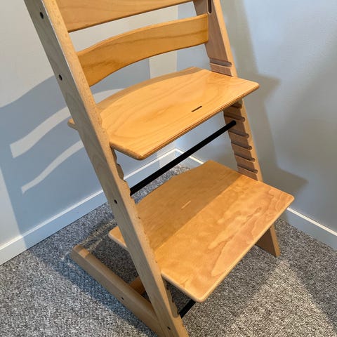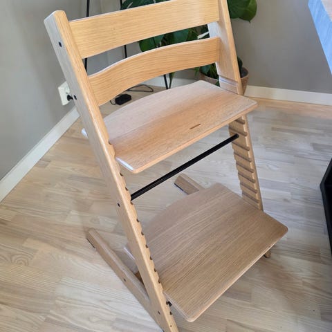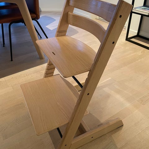 Stokke Tripp Trapp høy barnestol i tre. Stolen har justerbar sitteplate og fotbrett som kan tilpasses barnets høyde. Klassisk design som kan brukes ved spisebord eller arbeidsbord. Egnet som barnestol fra småbarnsalder og oppover, avhengig av montering og tilbehør som eventuelt brukes.