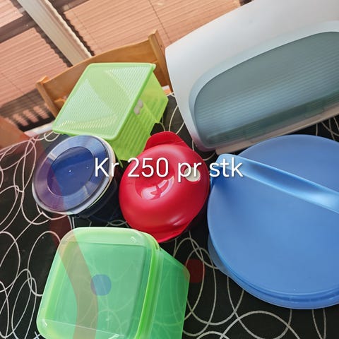 2 vintage Tupperware oppbevaringsboks i plast. Rektangulær beholder i turkis plast med hvitt lokk. Egnet til oppbevaring av mat i kjøleskap eller på kjøkkenbenk. Kan brukes til for eksempel pålegg, kakerester eller annen tørr- og kjølevarer. Lokket sitter tett for å beskytte innholdet. Plastmaterialet er lett og enkelt å rengjøre.