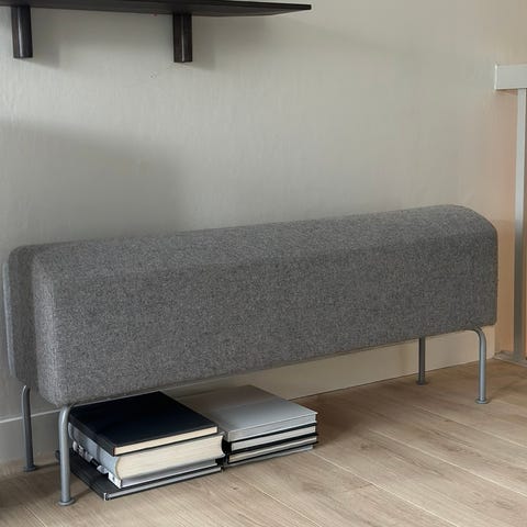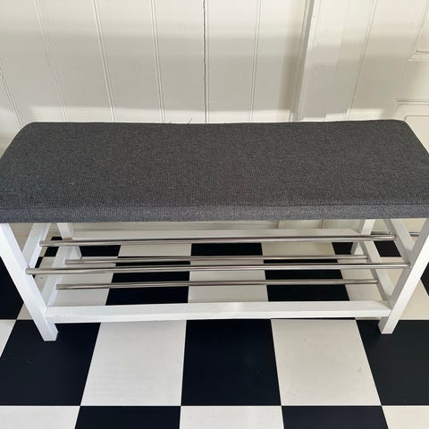 Eldre hvitmalt furubenk. Den er blitt grunnet før maling, og fremstår uten synlige merker/skader. Det er oppbevaring under sittedelen, hvor sittedelen kan taes helt av, der er det ikke blitt malt.