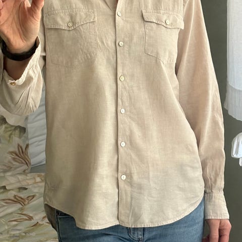 Cubus Lena Linen bluse for dame i størrelse M. Blusen er i beige lin, med kort erm og krage med V-utringning. Rett passform og lett, vevd materiale som egner seg godt til bruk alene eller under jakke eller cardigan. Passer til hverdagsbruk og enkle, pene antrekk.